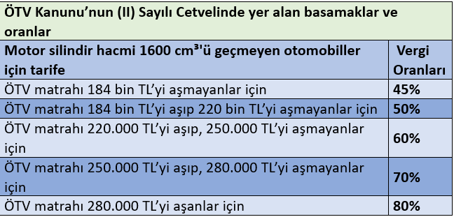 Yukarıdaki tabloya göre aracın vergisiz fiyatı 184 bin TL’yi aşmıyorsa vergisiz fiyatına yüzde 45 ÖTV oranı uygulanmaktadır. Ancak aracın vergisiz fiyatı 184 bin TL ile 220 bin TL (220 bin TL dahil) arasında ise vergisiz fiyatın tamamına yüzde 50; 220 bin TL ile 250 bin TL (250 bin TL dahil) arasında ise tamamına yüzde 60; fiyatı 250 bin TL ile 280 bin TL (280 bin TL dahil) arasında ise tamamına yüzde 70; fiyatı 280 bin TL’yi aşıyorsa tamamına yüzde 80 ÖTV oranı uygulanmaktadır.