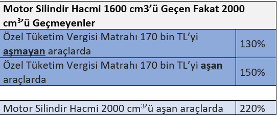 Diğer taraftan motor silindir hacmi 1600 cm³'ü geçen ama 2000 cm³'ü aşmayan otomobillerde vergisiz fiyatı 170 bin TL’yi aşmayanlar için yüzde 130; aşanlarda ise yüzde 150 ÖTV oranı uygulanmaktadır. Hatta motor silindir hacmi 2000 cm³'ü geçenlere yüzde 220 uygulanmaktadır. Elektrikli araçlarda ise bu oranlar yüzde 10 ila yüzde 60 arasındadır. Yüksek seviyedeki araçlardaki oranlar aşağıdaki tabloda da görülmektedir.