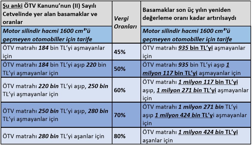 Daha basit bir ifadeyle motorlu araçlar için hesaplanan ÖTV’nin tabi olduğu tarife basamaklarının yükseltilmesinde yeniden değerleme oranı kadar artması gibi otomatik bir düzenlemenin bulunmaması daha fazla vergi (ÖTV ve KDV) ödememize neden olmaktadır.