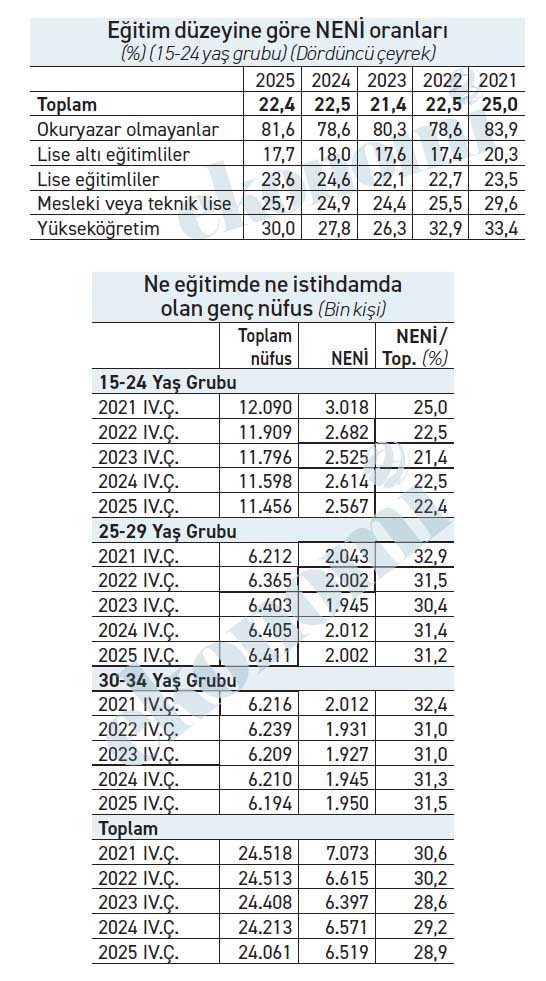 ✓ İşgücü istatistiklerinde çalışma çağındaki genç nüfus 15-34 yaş grubu olarak kabul ediliyor. 2025'in son çeyreği itibarıyla bu yaş grubundaki nüfus 24,1 milyon. Bu 24,1 milyon nüfusun 6,5 milyonu ne eğitimine devam ediyor, ne de çalışıyor.