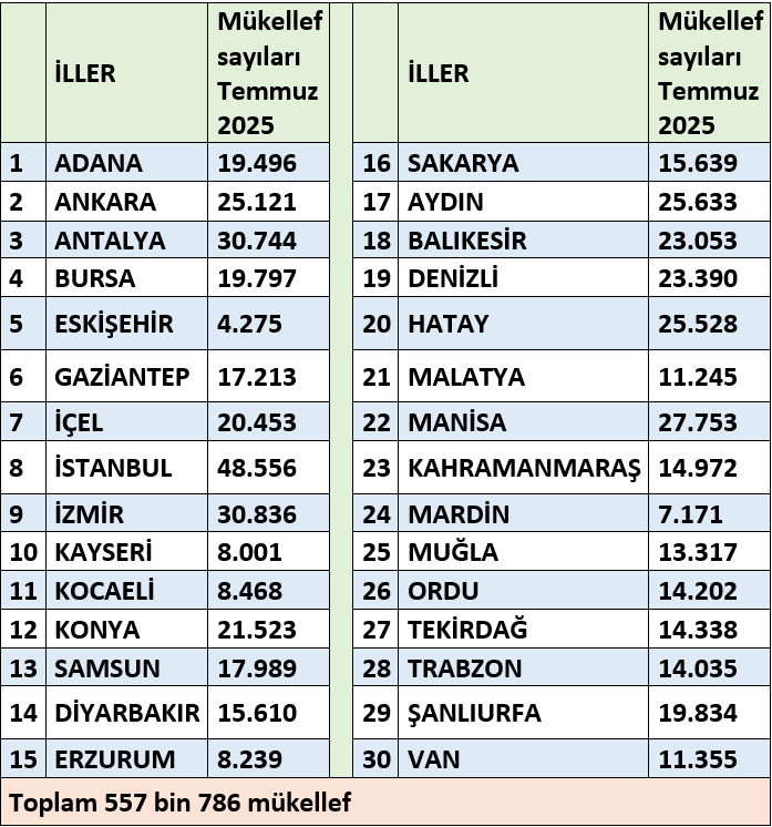Gelir İdaresi Başkanlığı verilerine göre 2025 Temmuz itibariyle 816 bin 51 basit usul mükellefi bulunmaktadır. İstanbul’da 48.556; Ankara’da 25.121; İzmir’de 30.836; Manisa’da 27.753; Samsun’da 17.989; Hatay’da 25.528; Denizli’de 23.390; Diyarbakır’da 15.610; Sakarya’da 16.639; Urfa’da 19.834 ve Konya’da 21.523 basit usul mükellefi bulunmaktadır.
