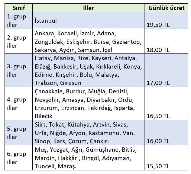 İllerin sınıflandırılması ve asgari ücret tutarları aşağıdaki gibidir.