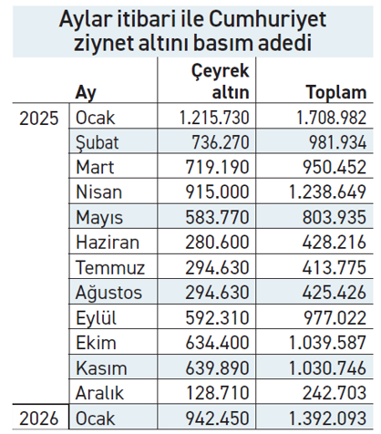 Yüksek altın fiyatları, yatırımcı ve tasarrufçu ilgisini canlı tutarken Darphane’nin cumhuriyet ziynet altını basımını artırmasına yol açtı. Bu yılın ilk ayında basılan Cumhuriyet altını adedi 1 milyon 392 bini aşarak son bir yılın en yüksek seviyesine ulaştı. Ocak ayında çeyrek altın üretimi de 943 bin adedi bularak 2025’in aynı döneminden daha yüksek gerçekleşti.