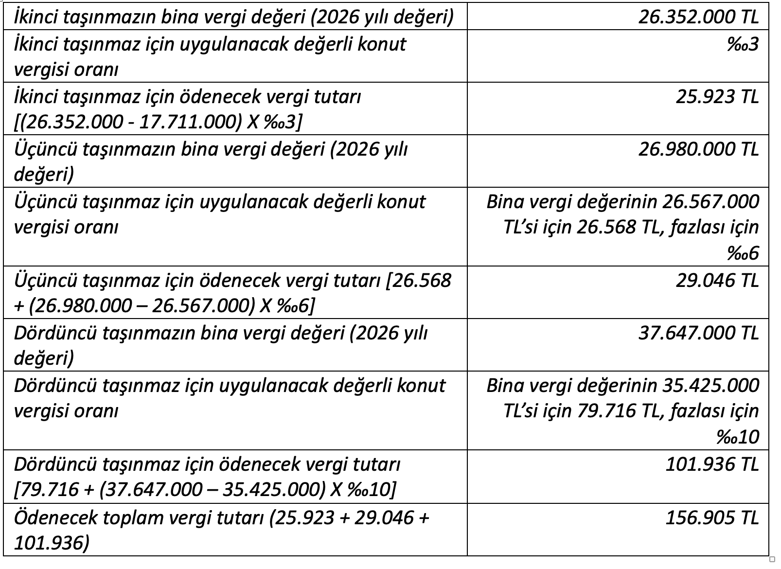 “Örnek 1: Mükellef (C)’nin mesken nitelikli 3 adet taşınmazı bulunmaktadır. Bu taşınmazların 2025 yılı bina vergi değerleri sırasıyla 15.000.000 TL, 20.000.000 TL ve 20.500.000 TL’dir. Mükellefe ait birinci taşınmazın 2025 yılı bina vergi değeri, 2025 yılı için 15.709.000 TL) aşmadığından verginin konusuna girmemektedir. İkinci ve üçüncü taşınmazların bina vergi değerleri söz konusu değeri 2025 yılı için 15.709.000 TL’yi aştığından değerli konut vergisine tabi olmaktadır..