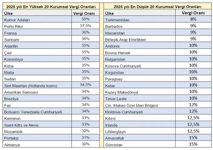 2025 yılında 13 ülke yasal kurumlar vergisi oranlarını değiştirdi. Sekiz ülke kurumlar vergisi oranını artırdı: Fas (yüzde 33'ten yüzde 34'e), Tunus (yüzde 15'ten yüzde 20'ye), Zimbabve (yüzde 24,73'ten yüzde 25,75'e), Estonya (yüzde 20'den yüzde 22'ye), Fransa (yüzde 25,83'ten yüzde 36,13'e), Litvanya (yüzde 15'ten yüzde 16'ya), Rusya Federasyonu (yüzde 20'den yüzde 25'e) ve Slovakya (yüzde 21'den yüzde 24'e).