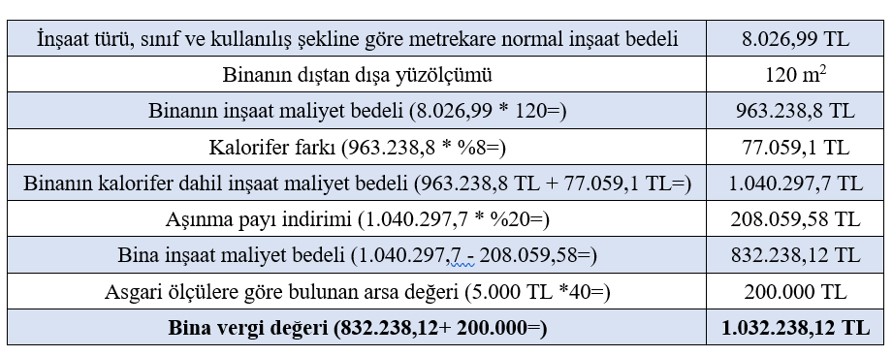 Daha basit bir şekilde yukarıdaki verileri dikkate alarak vergi değerinin hesaplanmasını göstereyim;