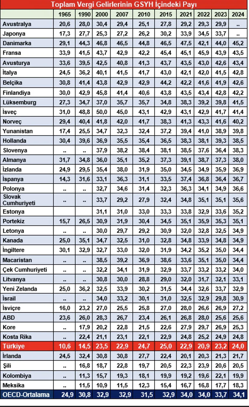Türkiye’nin 2024 yılı vergi yükü ise yüzde 24 düzeyindedir. Bu oran, OECD ortalamasının yaklaşık on puan altındadır. Türkiye’den daha düşük vergi yüküne sahip sadece dört ülke bulunuyor: Meksika, Şili, Kolombiya ve İrlanda.