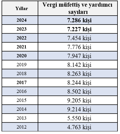 Aşağıdaki tabloda Vergi Denetim Kurulu’nun kuruluşunu müteakip yıldan bu yana vergi müfettişi ve vergi müfettiş yardımcılarının sayıları yer almaktadır.