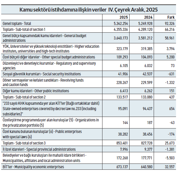 Belediyeler ve belediye şirketleri dahil, kamunun işçi ve memur çalışanı 2025’te 92 bin 326 kişi arttı. Son 5 yıldaki kamu doğrudan istihdamı ise 551 bin kişi artmış oldu. Öte yandan, toplam kayıtlı istihdamın Kasım 2025 itibariyle 23 milyon 775 bin kişi olduğu düşünüldüğünde, tüm çalışanların yüzde 22,5’inin istihdamını doğrudan kamu kurum ve kuruluşları sağladı.
