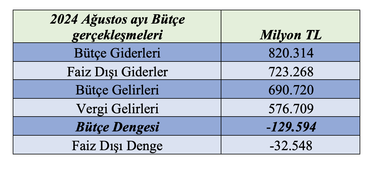 Merkezi yönetim bütçesi 2023 yılı Ocak-Ağustos döneminde 383 milyar 384 milyon TL açık vermiş iken 2024 yılı Ocak-Ağustos döneminde 973 milyar 554 milyon TL açık vermiştir. 2023 yılı Ocak-Ağustos döneminde 16 milyar 716 milyon TL faiz dışı fazla verilmiş iken 2024 yılı Ocak-Ağustos döneminde 209 milyar 545 milyon TL faiz dışı açık verilmiştir.