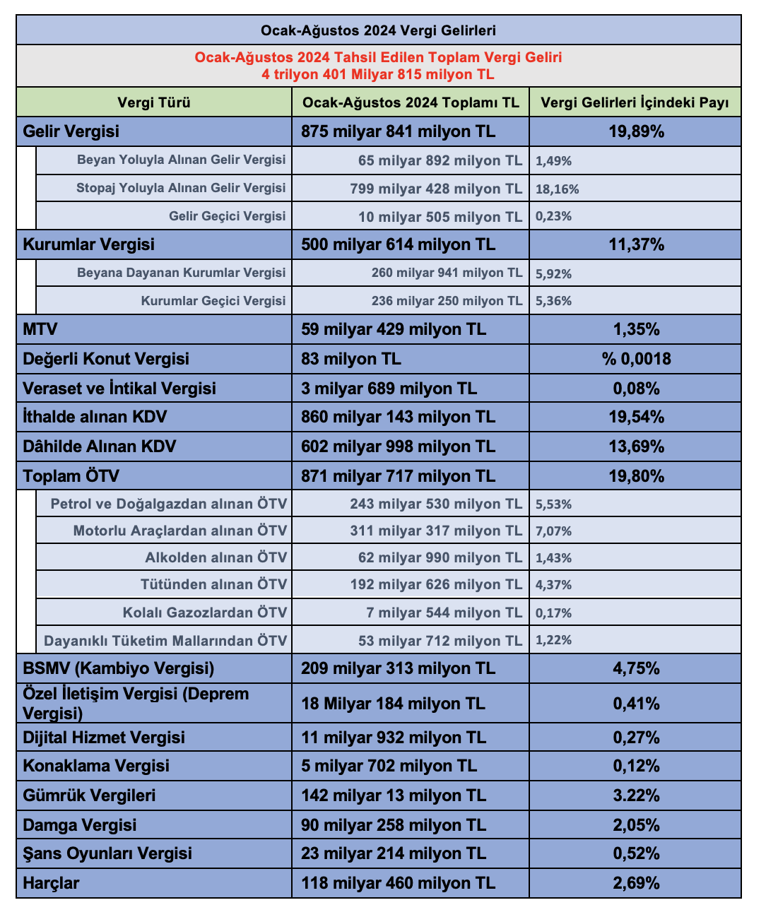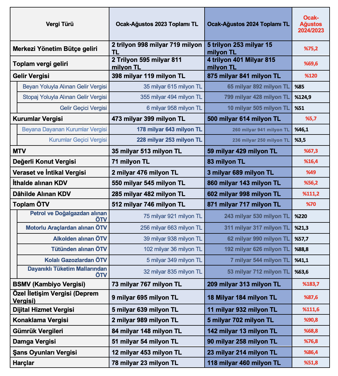 2024 yılı Ocak-Ağustos dönemi vergi gelirleri tahsilatı geçen yılın aynı dönemine göre yüzde 69,6 oranında artarak 4 trilyon 401 milyar 815 milyon TL olmuştur.