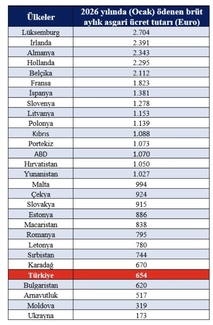 Aşağıdaki tablo, Avrupa Birliği İstatistik Bürosu’nun (Eurostat) 2026 yılı Ocak ayına ilişkin verilerinden yararlanılarak hazırlanmıştır. Karşılaştırmayı genişletmek amacıyla Avrupa Birliği üyesi olmayan bazı ülkelerin asgari ücret verilerine de tabloda ayrıca yer verilmiştir.
