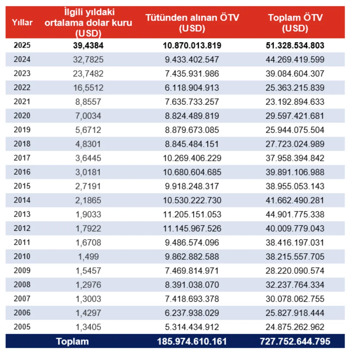 Bu nedenle aşağıdaki tabloda 2005 yılı ve sonrasına ait, yani son 20 yıllık dönemde gerçekleşen ÖTV tahsilatları, ilgili yılın ortalama dolar kuru esas alınarak ABD doları cinsinden hesaplanmıştır. Böylece dönemler arası karşılaştırma daha tutarlı bir zemine oturtulmuştur.
