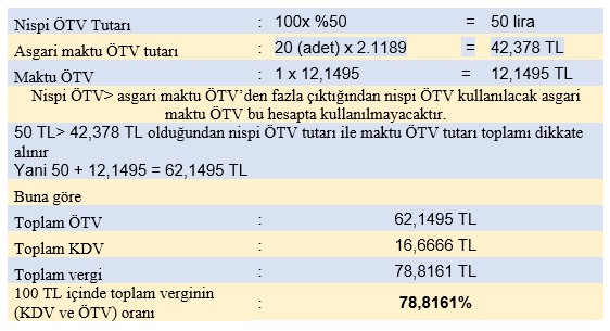 Örneğin 24 Ekim öncesi perakende satış fiyatı 100 TL olan 1 paket (20 adet) sigara için ÖTV aşağıdaki şekilde hesaplanır;