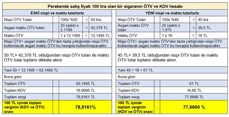 Özetle bu düzenleme, 100 liralık bir paket sigaradaki vergi yükünü yüzde 1,45 düşürmüş yani devletin vergi gelirini 1,1495 lira azaltmıştır. Bu tutar fiyatlara olumlu anlamda yansımazsa 100 liralık her paket için sigara firmalarının cebinde -düşen vergiden dolayı- 1 lira 15 kuruş kalacaktır.