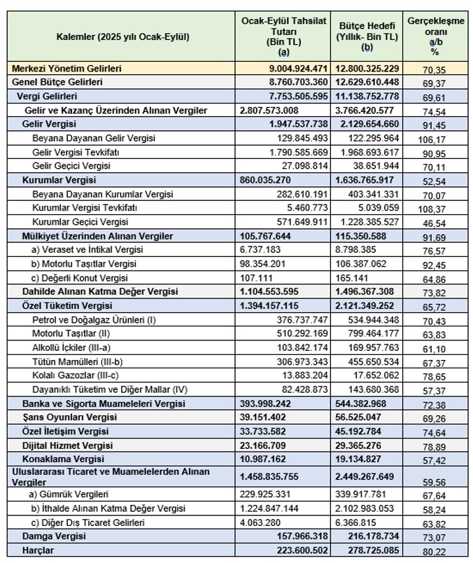 2025 yılı henüz bitmediğinden 2025 yılı bütçe Kanunu’nda öngörülen hedeflerin ne kadarının gerçekleştiğini şimdilik bilemiyoruz. Ancak ilk dokuz ay için (Ocak-Eylül) gerçekleşme verileri açıklanmıştı.
