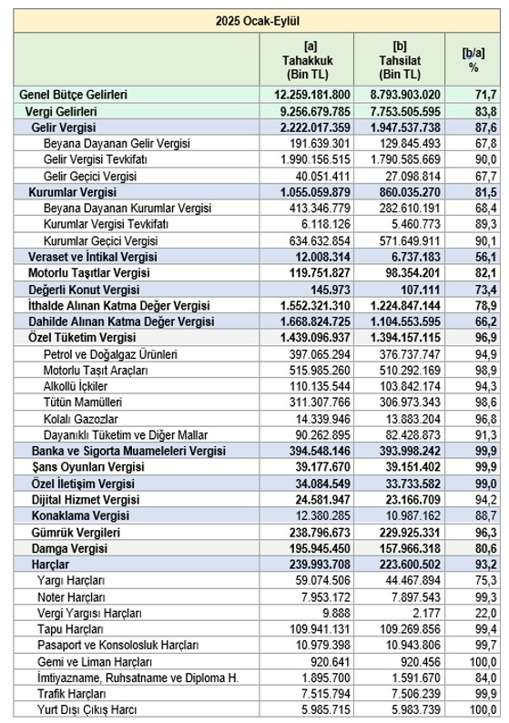 2025 yılı bütçe Kanunu’nda bir yıl için hedeflenen vergi geliri tutarı olan 11 milyar 752 milyonun yılın ilk dokuz ayında yüzde 69,61’i tahsil edilmiş. Yani yaklaşık 7 trilyon 753 milyar 505 milyon lirası tahsil edilebilmiş.