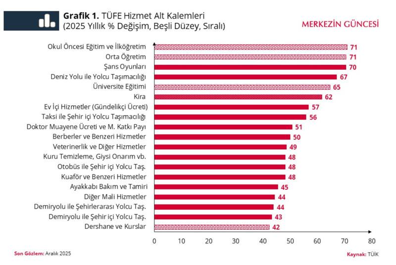 Beşli düzeydeki fiyat endekslerinin 2025 yılı artışları sıralandığında, en yüksek fiyat artışı gösteren ilk 30 kalemin 19’unun hizmet grubunda yer aldığı görülüyor. Hizmet tarafında üç grup öne çıkıyor: (i) eğitim, (ii) kira ve (iii) yerel nitelikli ve rekabetin görece sınırlı olduğu hizmet kalemleri.