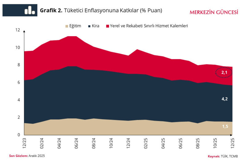 2025 yılı sonu itibarıyla bu katkı 7,8 puana gerilemiş olsa da halen yüksek. Yıl sonu itibarıyla kira, eğitim ve yerel/rekabeti görece sınırlı hizmet kalemlerinin enflasyona katkısı sırasıyla 4,2, 1,5 ve 2,1 puan düzeyinde. İncelenen hizmet kalemleri tüketici enflasyonunun yaklaşık dörtte birini oluşturuyor.