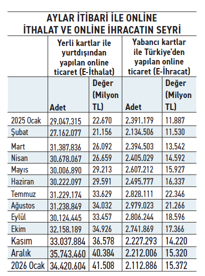 Veriler, yaşanan hareketliliğin yalnızca kısa süreli bir sıçrama olmadığını gösteriyor. Bankalararası Kart Merkezi verilerine göre yerli kartlarla yurtdışından yapılan online alışveriş hacmi geçen yıl Ocak ayında 22,6 milyar TL seviyesindeyken yıl sonunda 40,3 milyar TL’ye yükseldi. İşlem adedi de 29 milyondan 35,7 milyona çıkarak güçlü bir artış kaydetti.