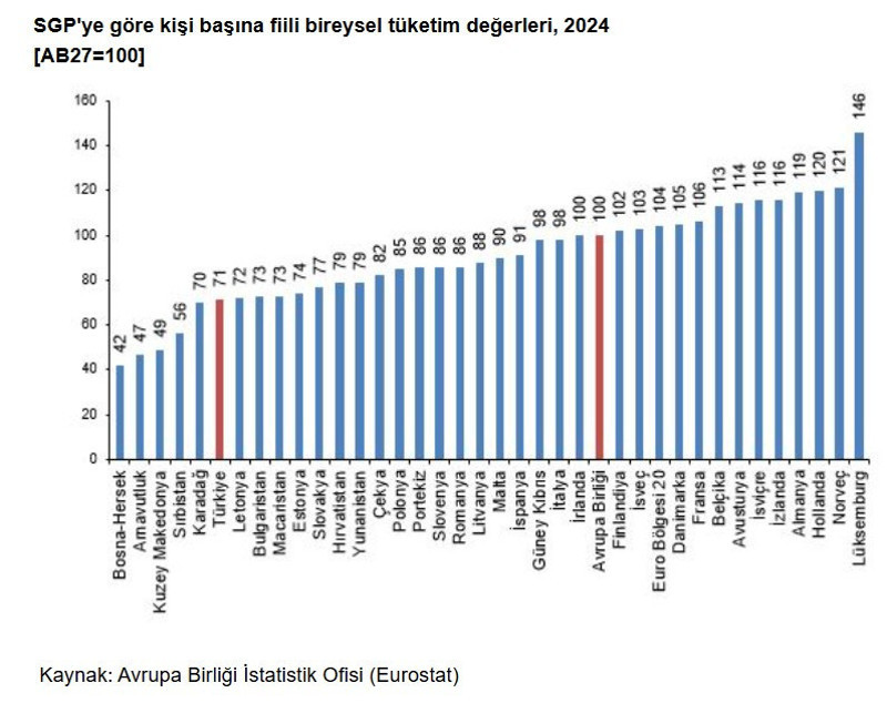 Kişi başına fiili bireysel tüketim düzeyi 27 AB ülkesi ortalaması 100 iken Türkiye için 71 oldu ve AB ortalamasının yüzde 29 altında kaldı. Karşılaştırmalarda yer alan 36 ülke arasında kişi başına fiili bireysel tüketim değeri en yüksek ülke 146 ile Lüksemburg, en düşük ülke ise 42 ile Bosna-Hersek olarak kayıtlara geçti.