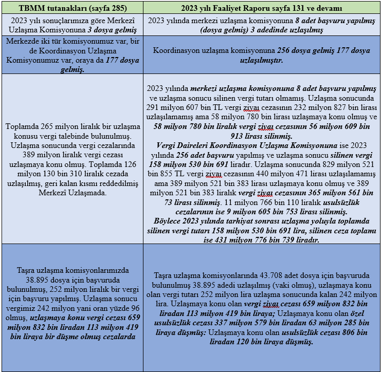 Bu kez yine uzlaşmayla alakalı tutanağın 285’inci sayfasında GİB Başkan yardımcısı “2023 yılı sonuçlarımıza göre Merkezî Uzlaşma Komisyonuna 3 dosya gelmiş 2023 yılında. Yalnız merkezde iki tür komisyonumuz var, bir de Koordinasyon Uzlaşma Komisyonumuz var, oraya da 177 dosya gelmiş. Toplamda 265 milyon liralık bir uzlaşma konusu vergi talebinde bulunulmuş. Uzlaşma sonucunda vergi cezalarında 389 milyon liralık vergi cezası uzlaşmaya konu olmuş. Toplamda 126 milyon 130 bin 310 liralık cezada uzlaşılmış, geri kalan kısmı reddedilmiş Merkezî Uzlaşmada. Taşra uzlaşma komisyonlarımızda 38.895 dosya için başvuruda bulunulmuş, 252 milyon liralık bir vergi için başvuru yapılmış. Uzlaşma sonucu vergimiz 242 milyon yani oran yüzde 96 olmuş, uzlaşmaya konu vergi cezası 659 milyon 832 bin liradan 113 milyon 419 bin liraya bir düşme olmuş cezalarda efendim. Faaliyet raporlarımızda her yıl düzenli yayınlanıyor bu veriler efendim.” şeklinde izahatta bulundu.