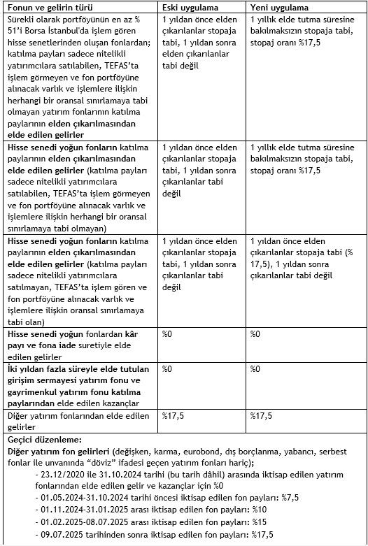 Bu düzenlemeye göre, sürekli olarak portföyünün en az %51’i Borsa İstanbul'da işlem gören hisse senetlerinden oluşan fonlardan; katılma payları sadece nitelikli yatırımcılara satılabilen, TEFAS’ta işlem görmeyen ve fon portföyüne alınacak varlık ve işlemlere ilişkin herhangi bir oransal sınırlamaya tabi olmayan yatırım fonları katılma belgeleri 1 yıl elde tutulduktan sonra 19.12.2025’ten itibaren elden çıkarılmaları halinde stopaja tabi tutulacaklar.