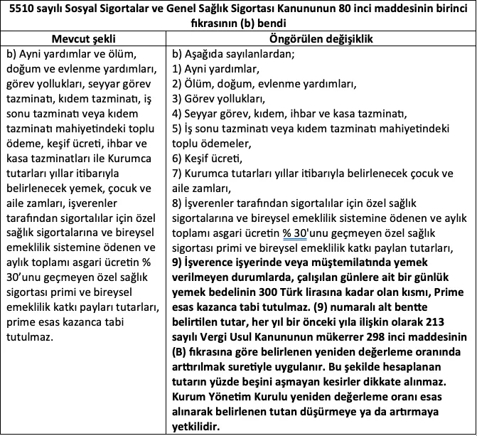 Yapılması düşünülen değişiklikle, ayni yardım niteliği tartışmasız olan yemek yardımlarının, tutara bağlı olarak kısmen (günlük 300 TL’yi aşan kısmının) sigorta prim kesintisine tabi tutulması öngörülüyor.