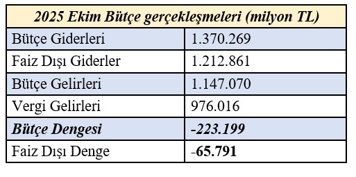 Merkezi yönetim bütçesi 2024 yılı Ekim ayında 186 milyar 271 milyon TL açık vermiş iken 2025 yılı Ekim ayında 223 milyar 199 milyon TL açık vermiştir. 2024 yılı Ekim ayında 50 milyar 53 milyon TL faiz dışı açık verilmiş iken 2025 yılı Ekim ayında 65 milyar 791 milyon TL faiz dışı açık verilmiştir.