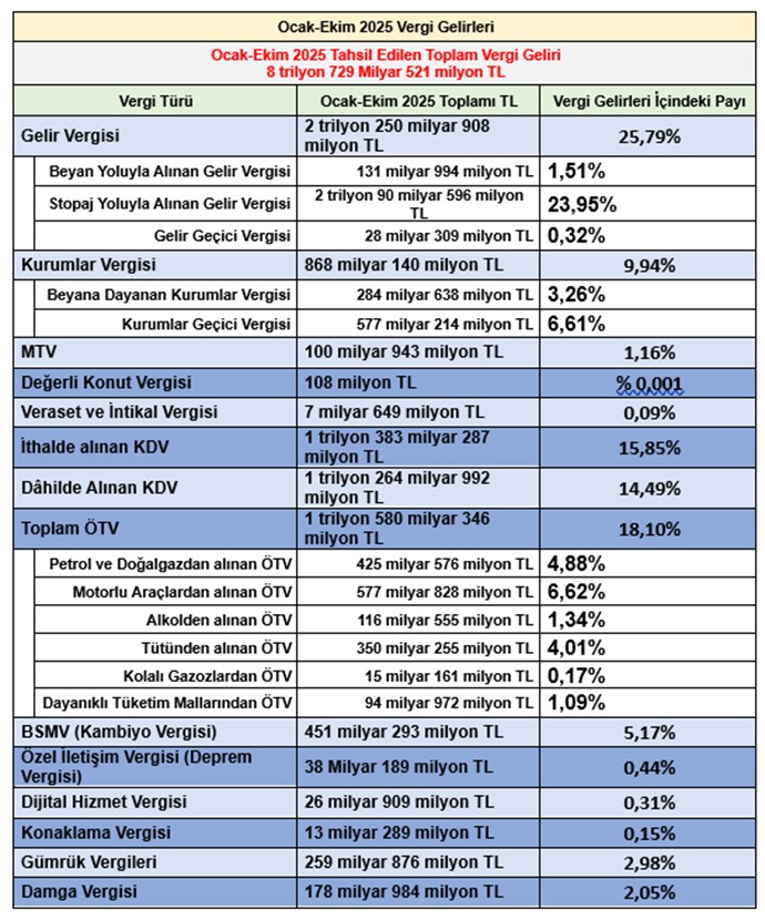 Aşağıdaki tabloda vergi kalemleri bazında Ocak-Ekim 2025 tahsilat tutarları ile geçen yılın aynı dönemdeki tahsilat tutarları ve değişim oranları bulunmaktadır.