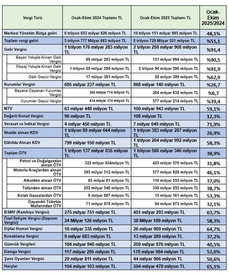 2024 yılı Ocak-Ekim döneminde bütçe gelirleri 6 trilyon 853 milyar 826 milyon TL iken 2025 yılının aynı döneminde yüzde 48,1 oranında artarak 10 trilyon 151 milyar 995 milyon TL olarak gerçekleşmiştir. 2025 yılı Ocak-Ekim dönemi vergi gelirleri tahsilatı geçen yılın aynı dönemine göre yüzde 51,1 oranında artarak 8 trilyon 729 milyar 521 milyon TL olmuştur.